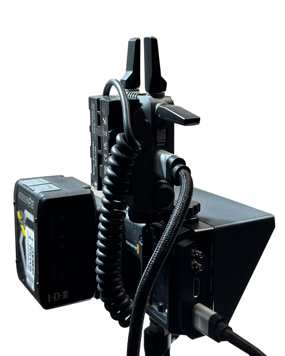 Our small wireless Directors monitor kit combines our DJI Transmission wireless video kit and Blackmagic 5 inch HDR monitor into a small handheld package which includes the of Smaller IDX Vlock Micro dual battery kit and HDMI and SDI video connection between the wireless video receiver and the 12G monitor.